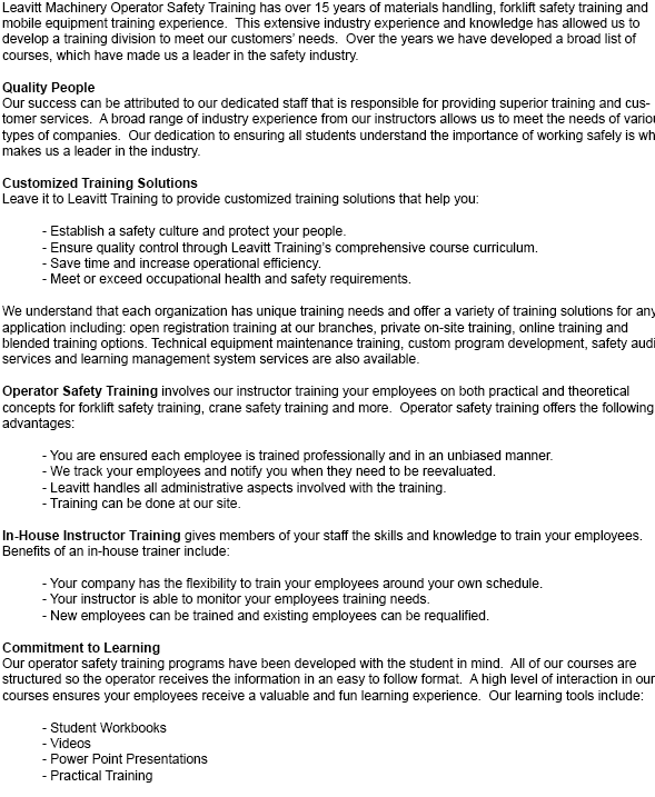 With such a great variety of choices for certification, you are assured to come across one that meets your needs. Furthermore, we present you two choices for training. We can provide it on-site or at our place of business. Our ability to tailor our instruction methods to your equipment is what sets us apart from our competition.